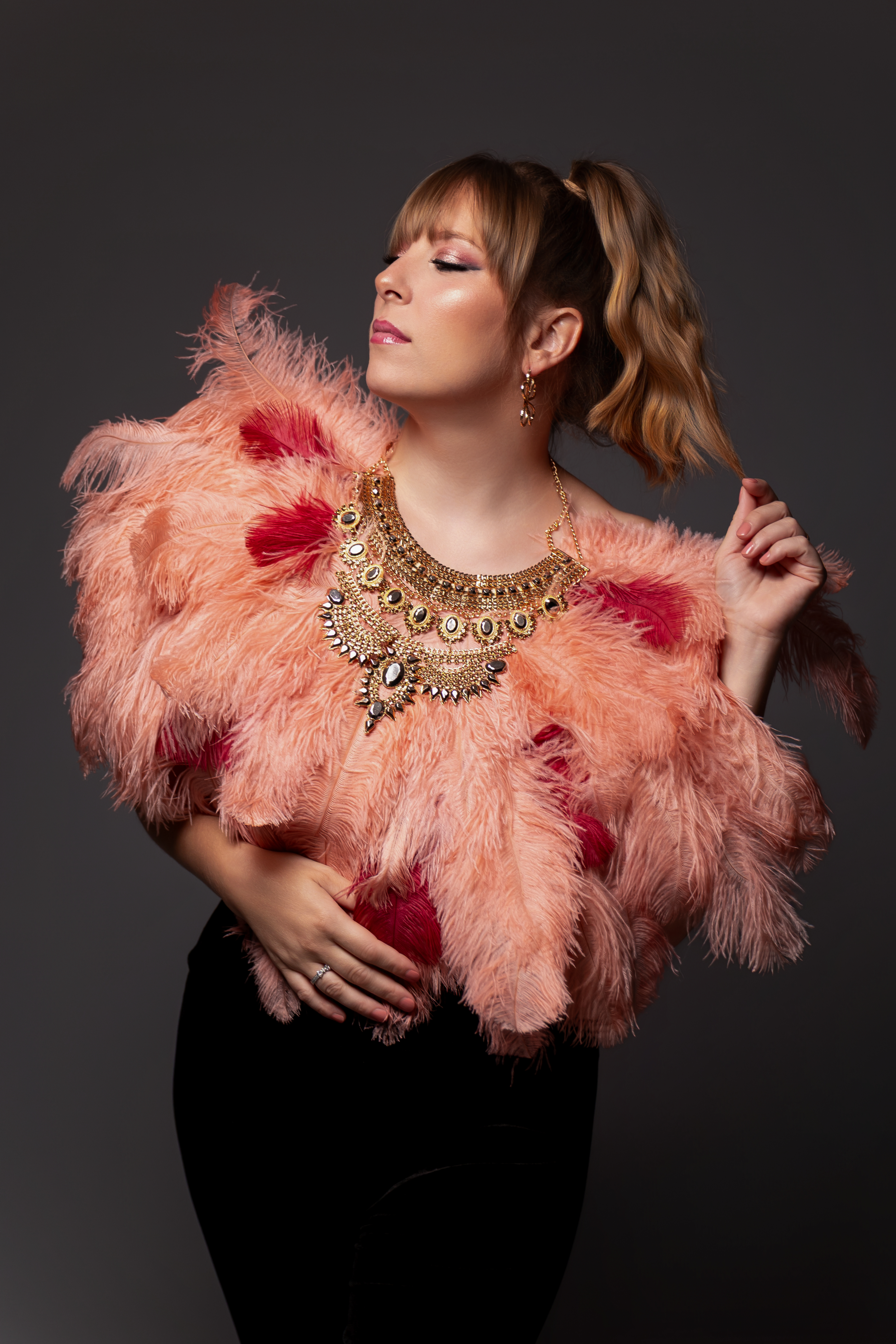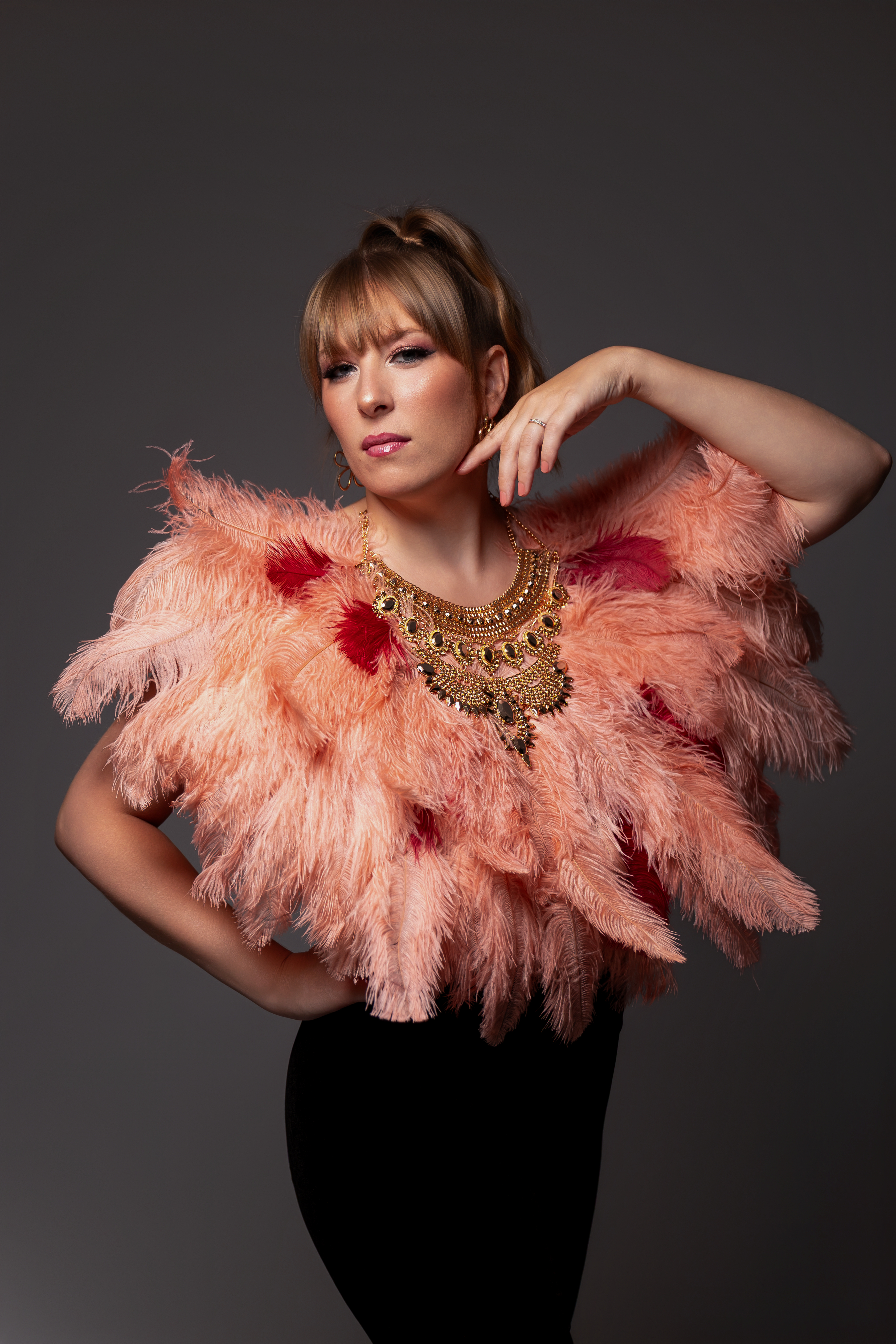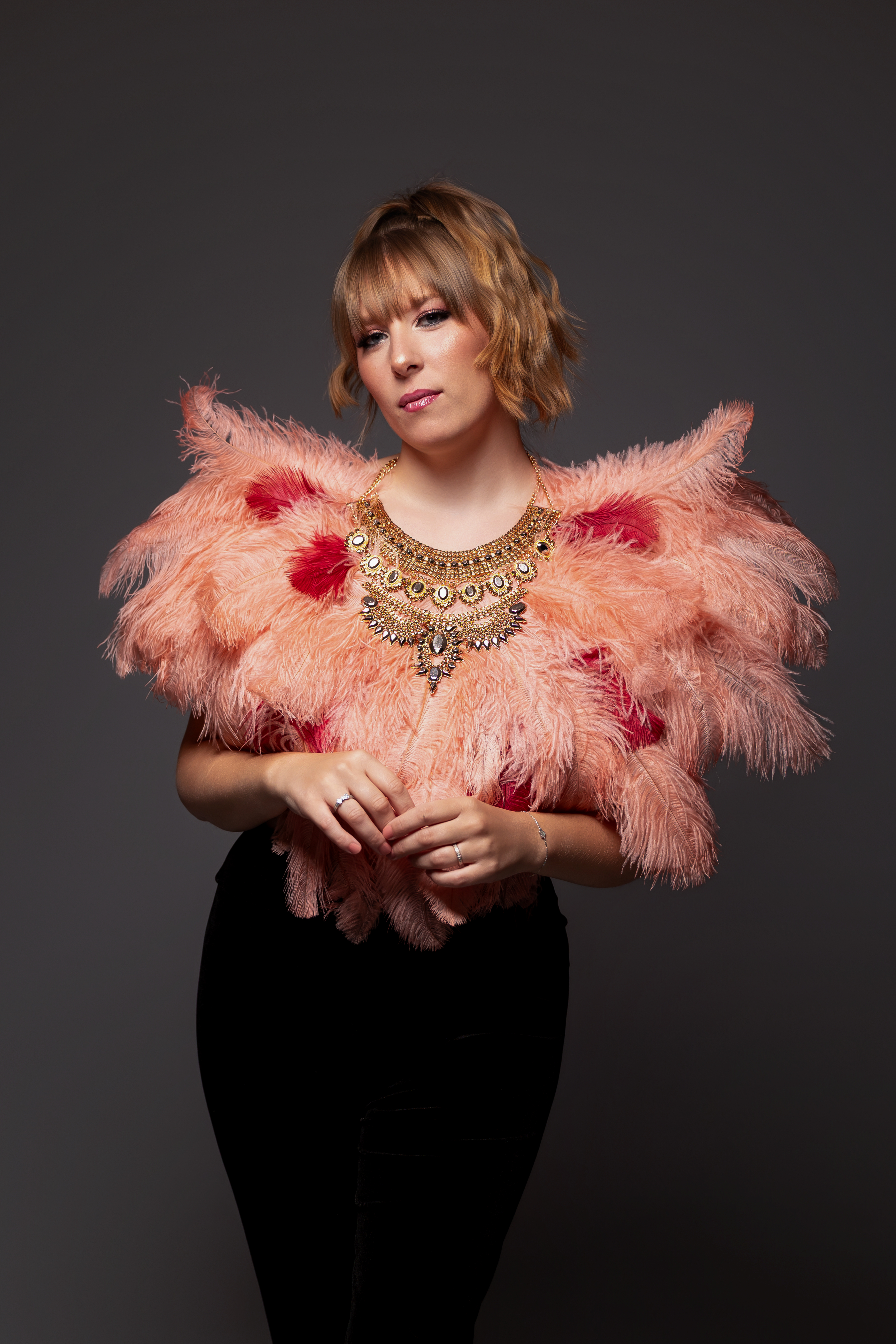 Venez avec un simple pantalon et habillez vous d’un collier en plume rose pour des images pleines de douceur.